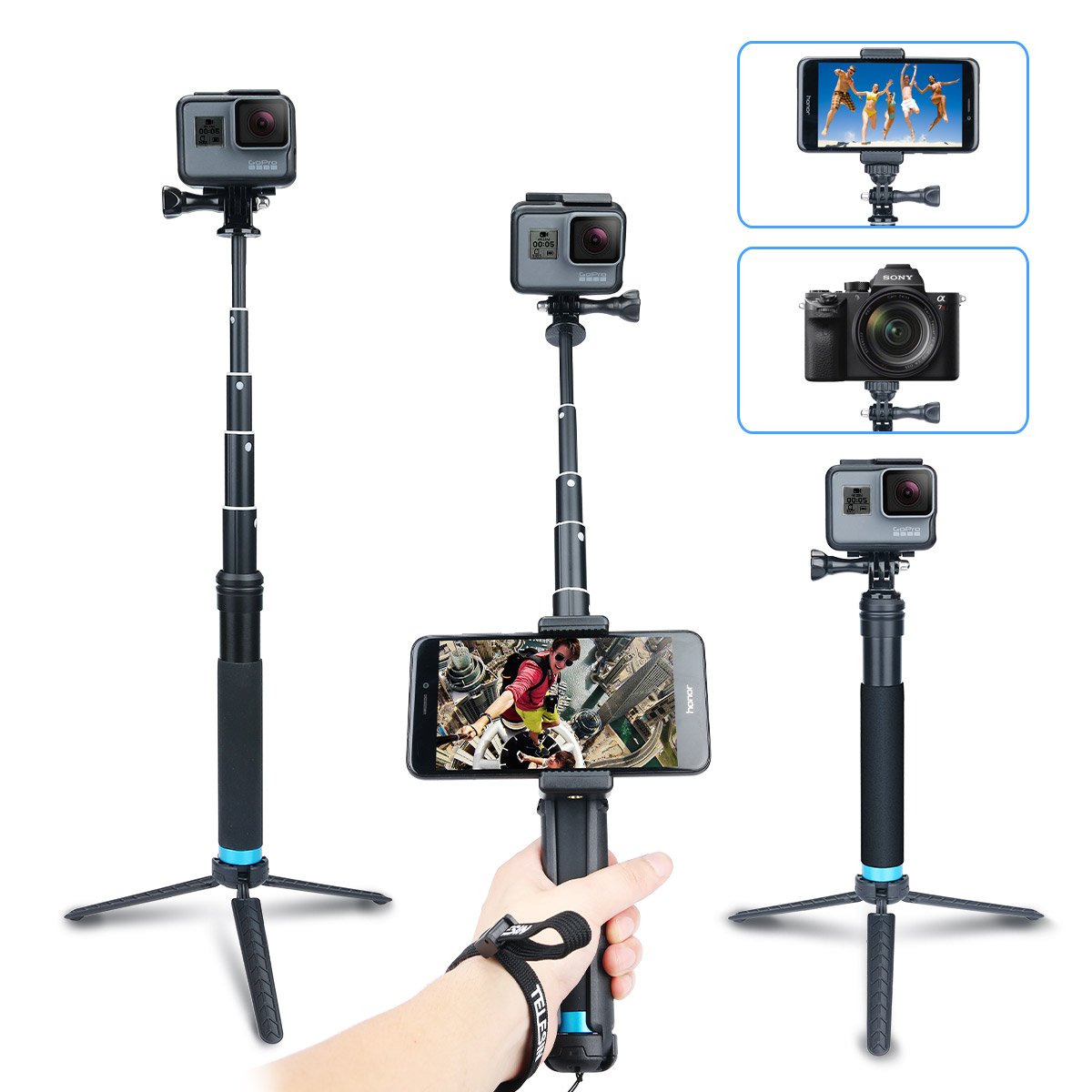 AFAITH Palo telescopico a bastone autofilettante estensibile in lega di alluminio con cinghia regolabile in polso e supporto flessibile monopiede per treppiede per GoPro Hero 6 5 4 3 2 - GP073 descrizione