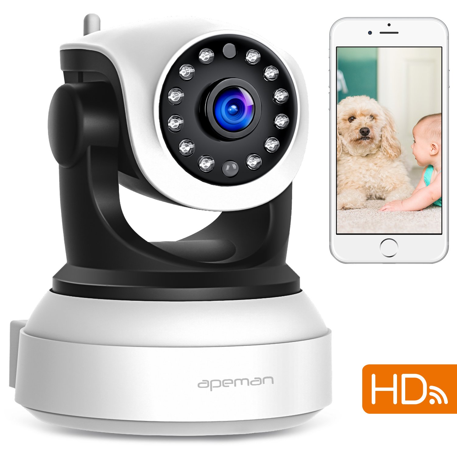 APEMAN 720P Telecamera IP Camera WIFI, Videocamera di Sorveglianza con Visione Notturna, Audio Bidirezionale, Sensore di Movimento PanTilt, P2POvnif2.4GHz, Compatibile con iOSAndroid descrizione